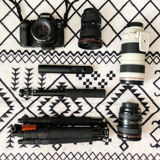 这一次带着的相机是佳能5D4,镜头主要使用24-105、70-200,偶尔会用501.4、16-35。除了这些传统拍摄器材之外,还带了一个特别有意思的全景相机——Qoocam,它可以完成很多有意思的自拍,无论是手持、使用自拍杆还是放置在地上,都可以拍出有意思的画面。