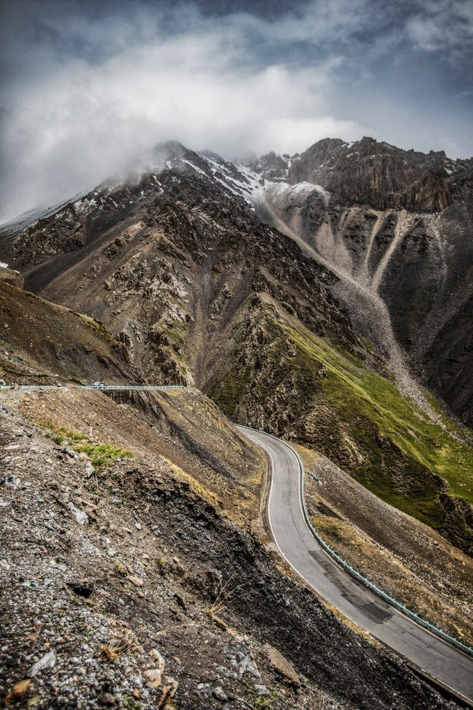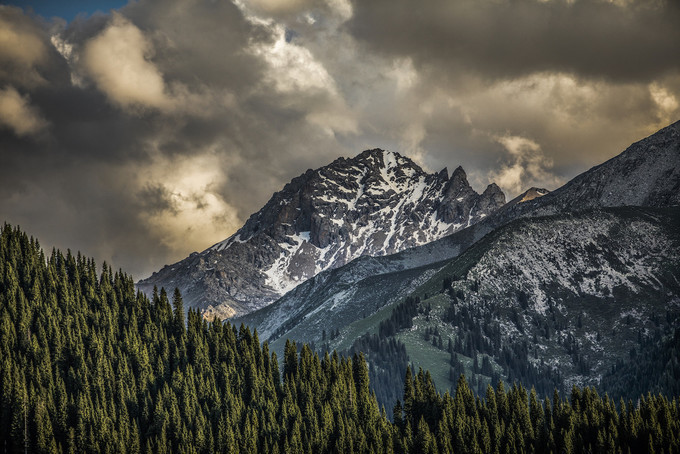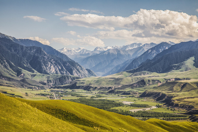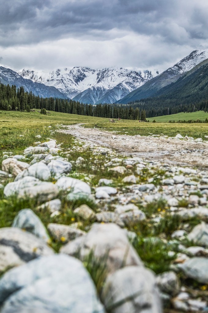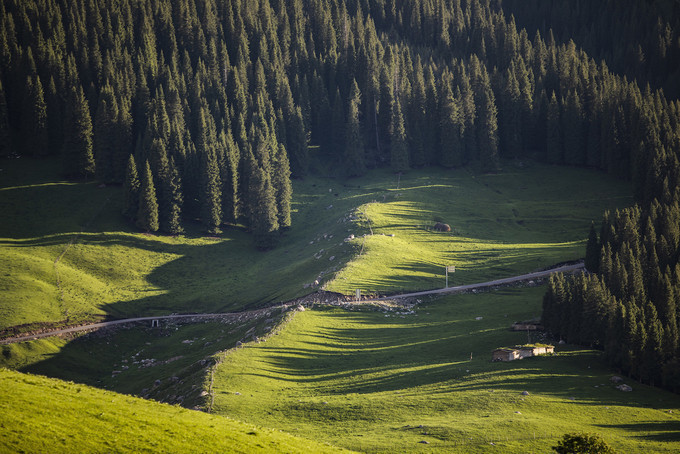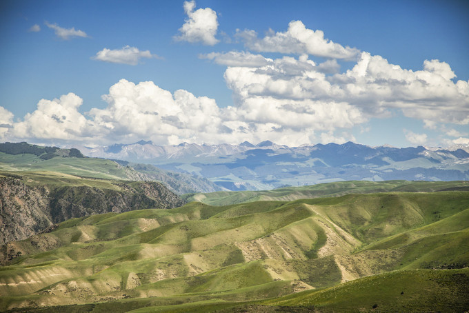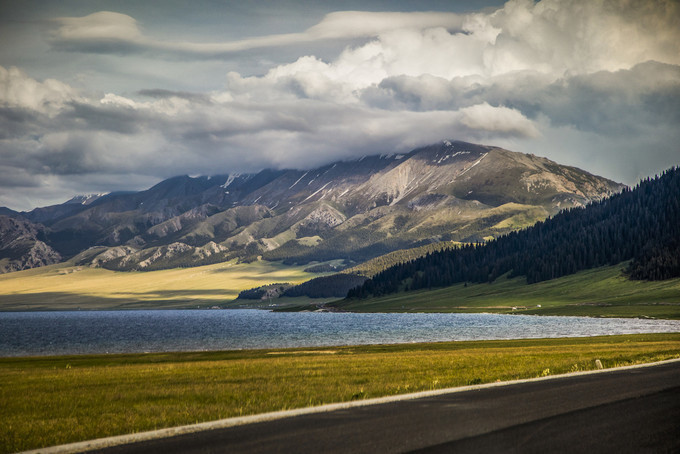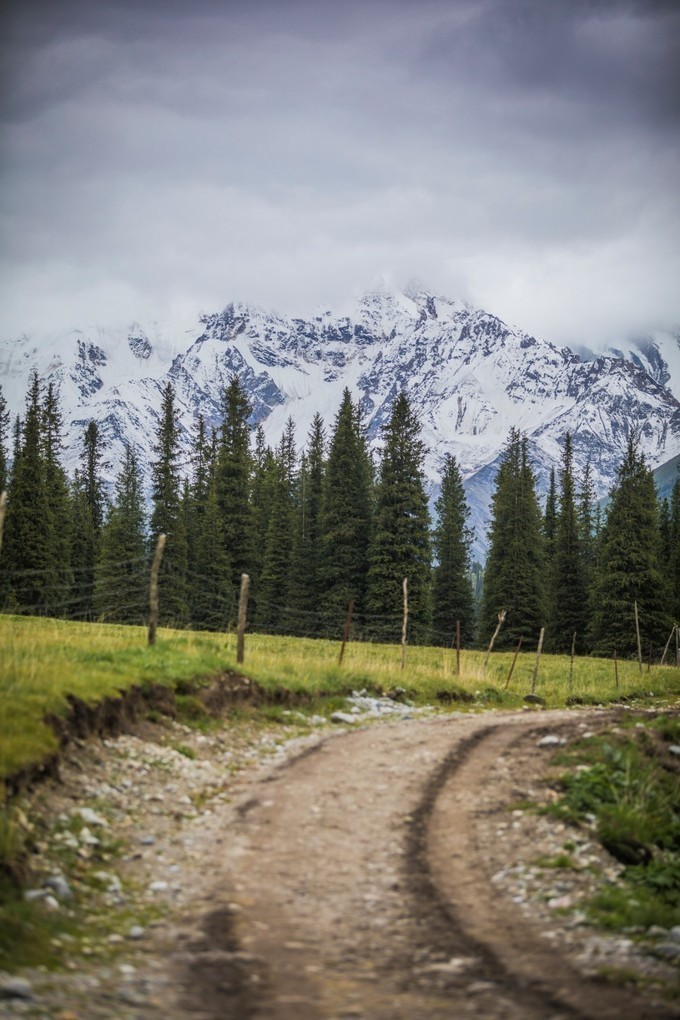 去往琼库什台的路虽然曲折但是非常美丽,一直有大大小小的雪山和垂直森林草原在身边。