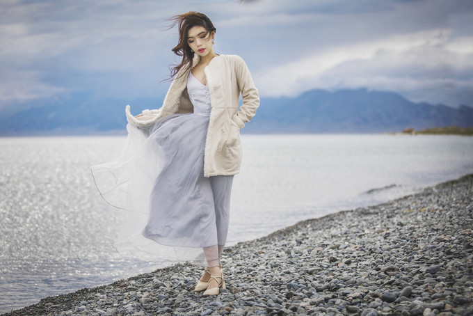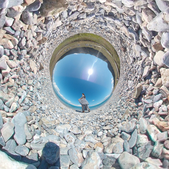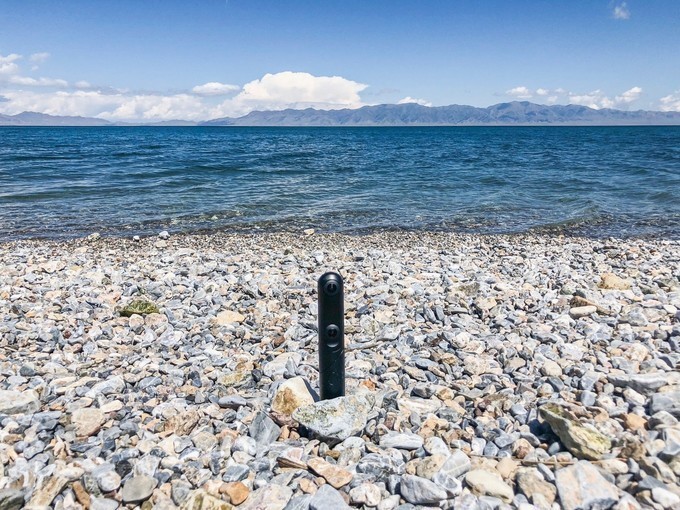 这两张照片是自拍的,而且是用同一张照片做出的不同效果哦。照片是用Qoocam自拍哒。Qoocam的底部是平的,在平地上可以直接放置,但是在湖边的石子上直接放就放不稳了,我用三块石头把它夹住立了起来,就可以正常站立了。
