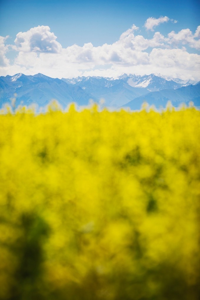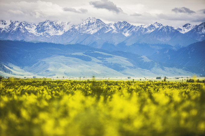 昭苏 还有一个著名的地方在于这是 天山 脚下的万亩油菜花田,今年的天气比较冷,6月中旬油菜 花都没有全开,好不容易找到一片开得还行的油菜花,赶紧拍起来!