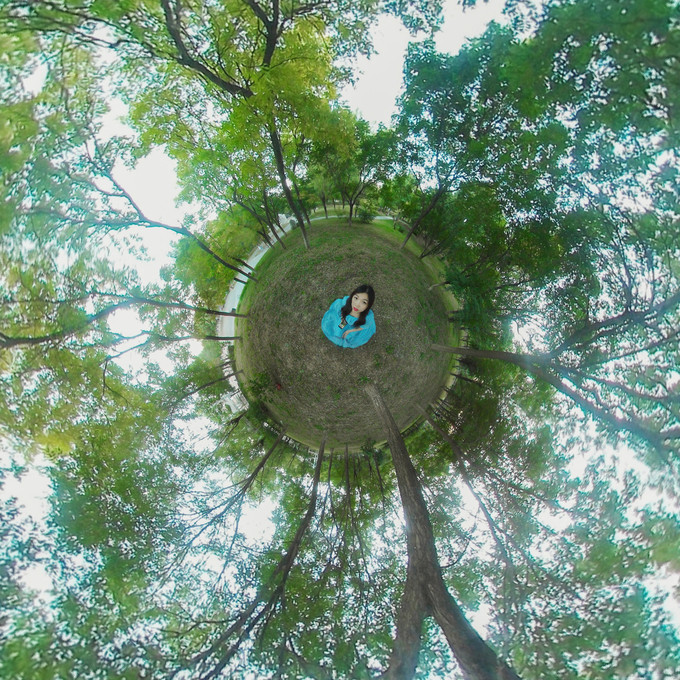 在这个全景画面中,Qoocam本身是会自动隐身的,看下面的照片,是找不到相机本机的身影,但是地上的影子暴露的它哈哈哈哈。
