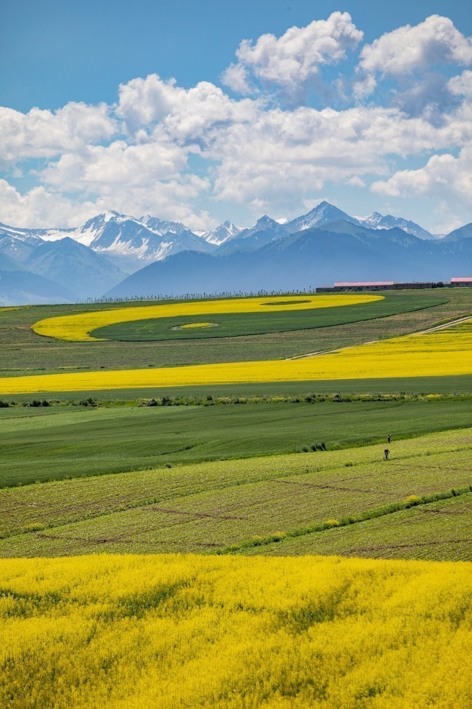 由于昨天晚上拍了星空,早上从琼库什台离开的时候我都昏昏沉沉的,确实有点浪费这样的好天气,直到再次回到 特克斯 附近,看到了这样的油菜花八卦图,才终于清醒了哈哈。
