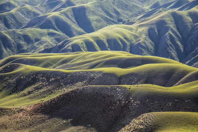 喀拉峻另外一个经典的风景是人字型草原,就是下图这种,在光影中的草原形状有规律的形状,好像一个“人”字型,最经典的照片需要拿200毫米以上的长焦才能拍到。