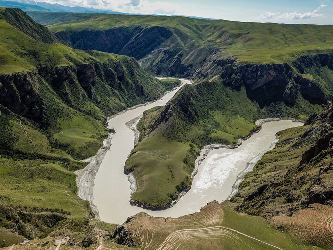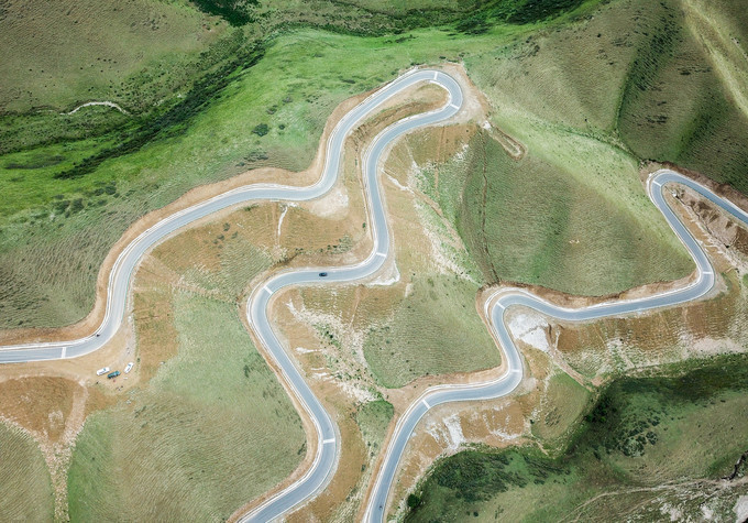 特克斯 到琼库什台里程上是80公里,但是要开6个小时的车,这是因为一路上都是山路弯道,速度只能开很慢。这是用无人机拍的一张山路,你们感受一下这些大弯道~