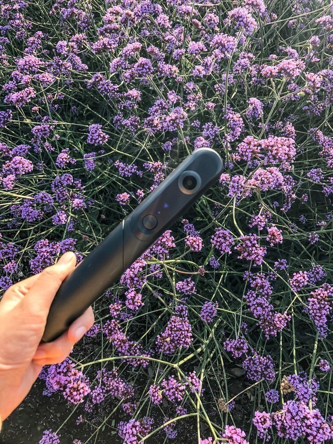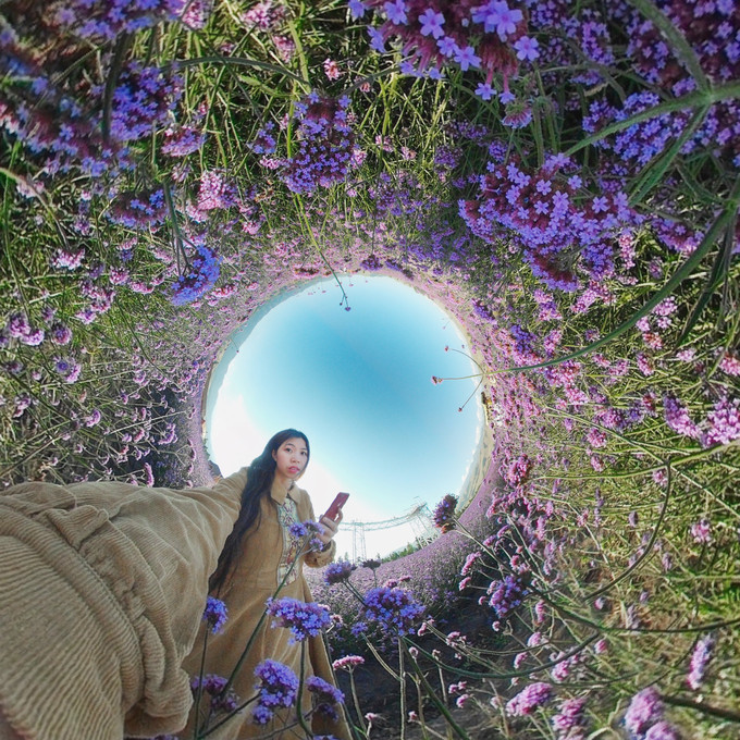 进入到花海,真的满眼全是格桑花和马鞭草,拿出Qoocam,在这里自拍会有一种花花星球的感觉。