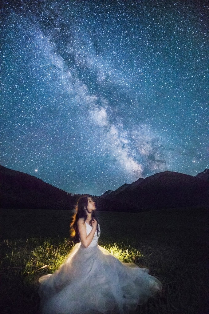 前几天在果子沟没有 成功 拍到星空,今天晚上的星空看起来不错,所以半夜2点起来敲醒了司机小哥,大半夜去拍了这样的一张照片,虽然是6月,半夜的风也还不是盖的!虽然脸拍得有点糊,但也回本了!