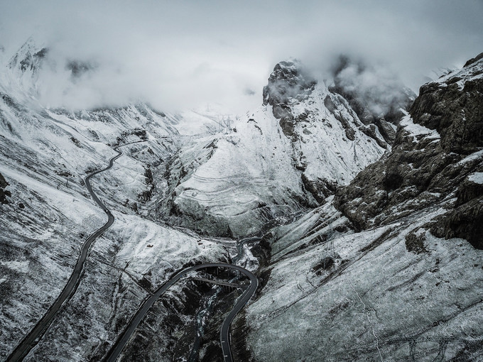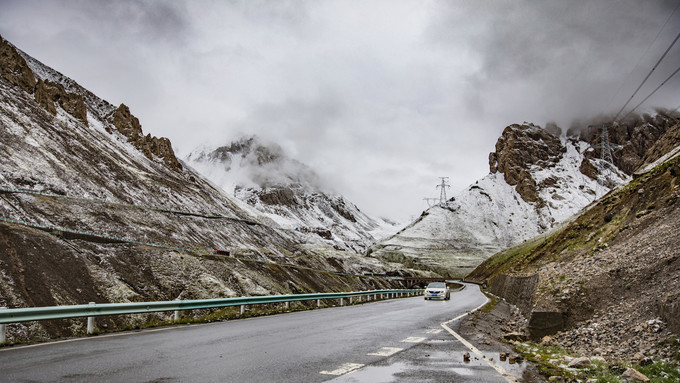我们把车停在安全停车处,外面下着小小的雨,我把无人机升上去,升上300米时上面就在下雪了。