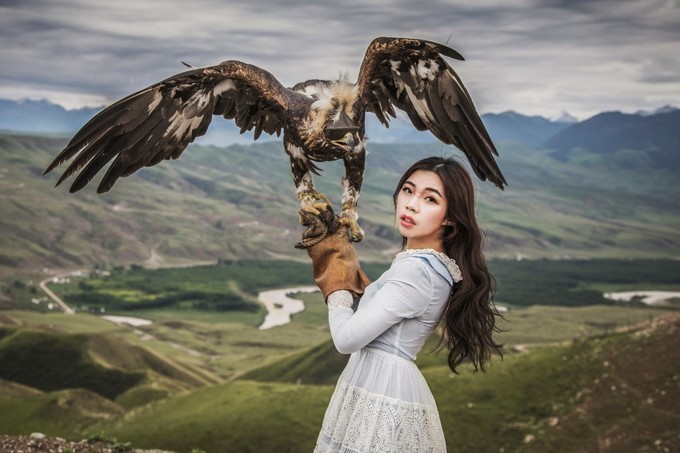 在山路中有一个观景台休息站,发现一个牧民带着一只猎鹰,于是我就举着拍了一张,算是这趟行程中相当喜欢的照片了。鹰真的超级重,牧民可以单手举起来,女生必须要用双手。