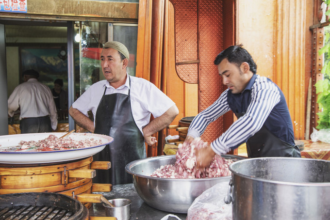 在街口有传统的烤包子,维族大哥熟练地搅合着一大锅肉,旁边蒸炉里正在烤的包子香味袭人哦