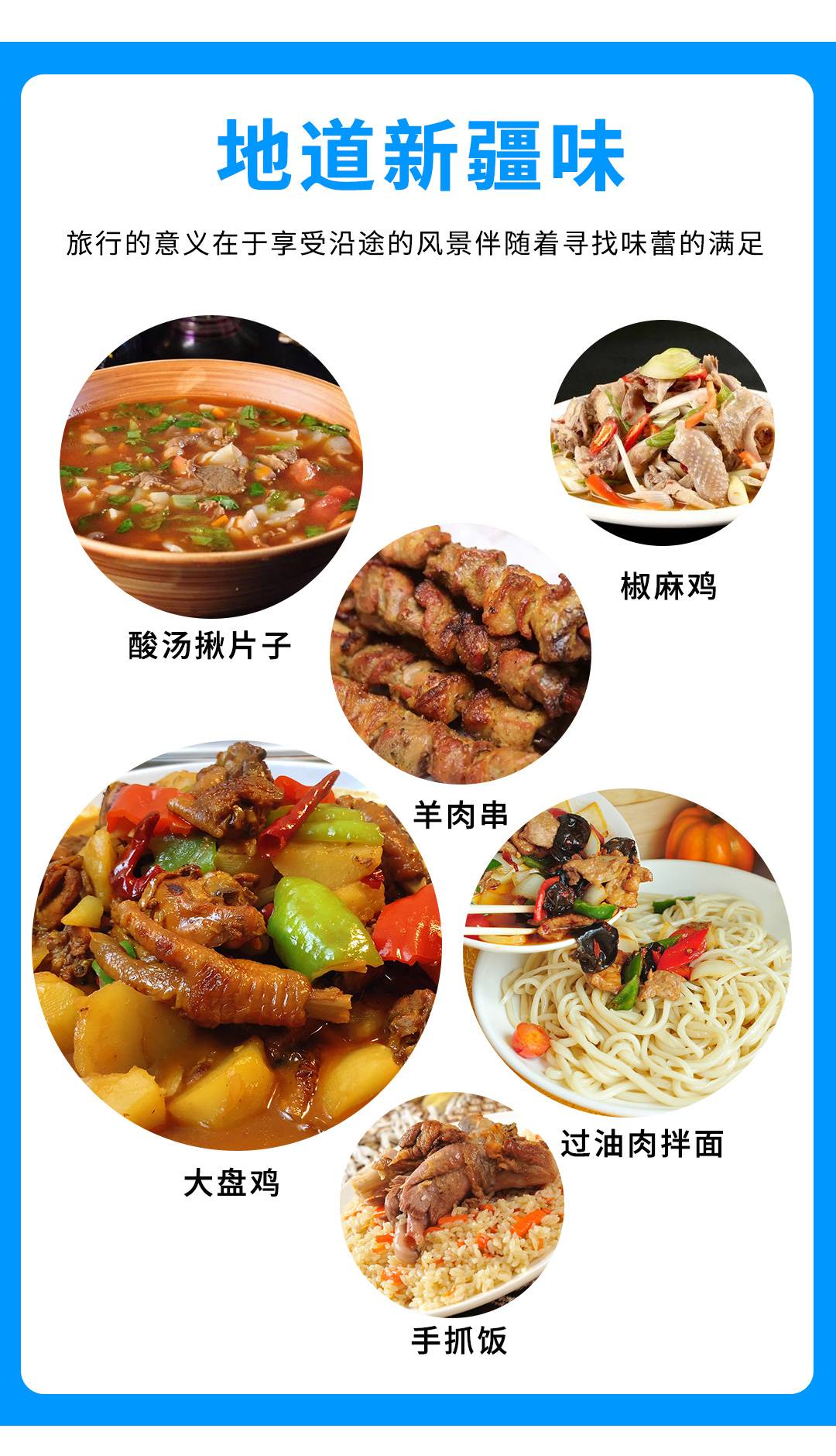 4、饮食指南:新疆是多民族聚集地,穆斯林不食猪肉,饮食中有诸多禁忌,请大家不要冒犯。新疆日常餐饮以牛羊肉为主,口味偏重,喜好辛辣,部分欠发达地区无汉餐供应,请大家做好心理准备